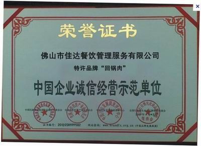 佳达回锅肉荣获证书